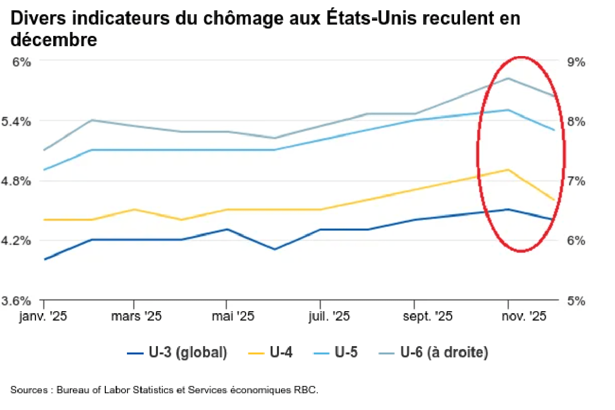 Le marché de l’emploi termine 2025 sur de meilleures assises que prévu. Contre toute attente, le taux de chômage a baissé pour atteindre 4,4 % en décembre, l’économie ayant créé 50 000 emplois. Fait à noter, les données d’octobre ont été révisées considérablement à la baisse (de -105 000 à -173 000), ce qui porte à croire que la paralysie gouvernementale a eu une incidence plus importante que prévu sur les embauches. En ce sens, les données douteuses continuent de brouiller un marché de l’emploi par ailleurs faible. La révision à la baisse du taux de chômage en novembre est cependant le résultat d’une mise à jour annuelle des facteurs saisonniers et non d’une révision des données recueillies. Ce qui nous frappe, c’est qu’après le ralentissement qui a commencé en mai, le taux de chômage n’a augmenté que modestement, passant de 4,3 % à 4,4 %, malgré les gains mensuels moyens de seulement 11 000 emplois au cours de la même période. Cela porte à croire que le niveau d’emploi neutre pourrait être inférieur à notre estimation précédente de 40 000 emplois par mois.