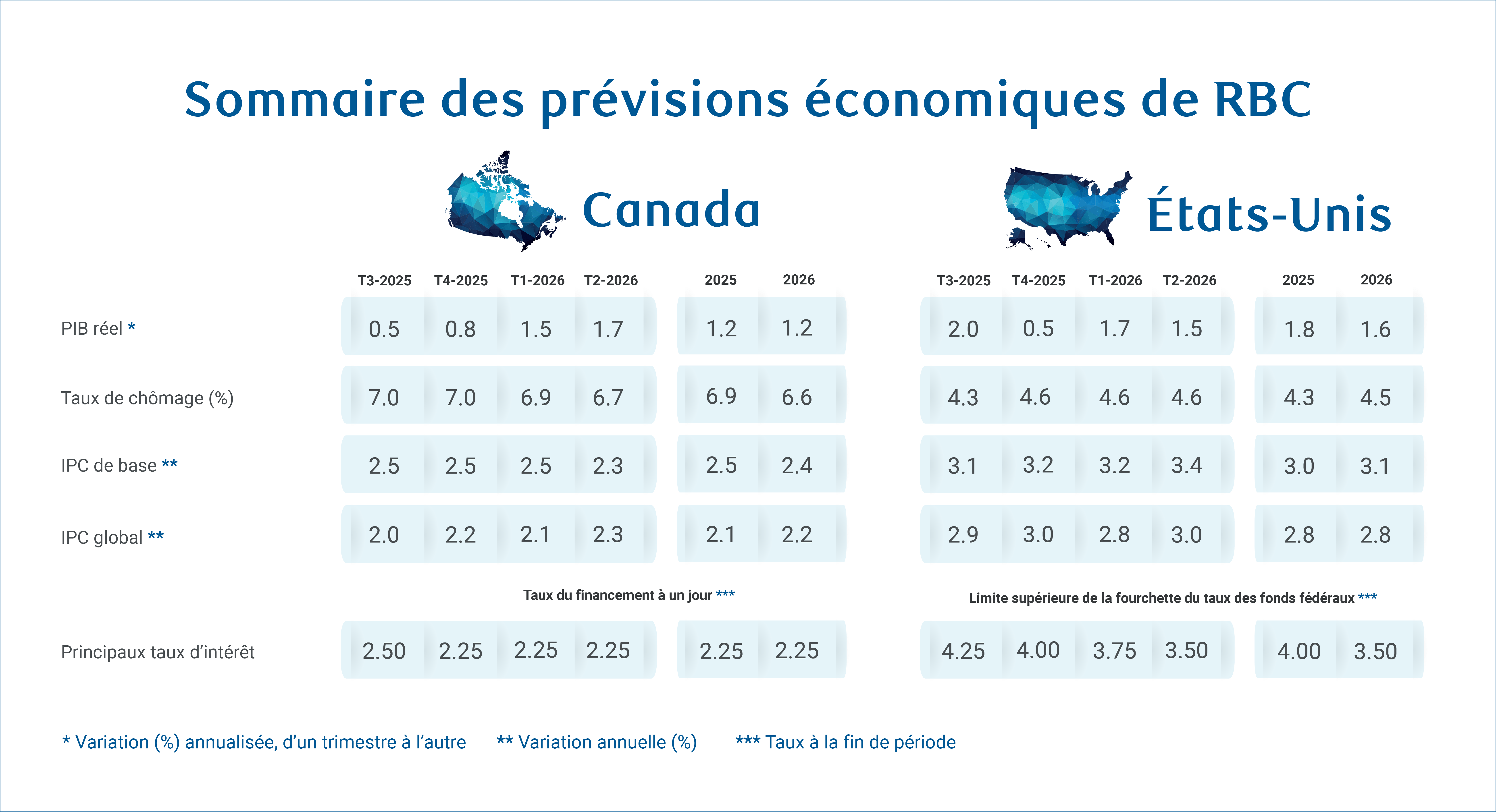 Les Services économiques RBC fournissent des prévisions sur les principaux indicateurs économiques, notamment la croissance du PIB, l’inflation, l’emploi et les taux d’intérêt pour le Canada, les États-Unis et d’autres grandes économies à l’échelle mondiale. Nos perspectives vous aident à prendre des décisions éclairées dans un monde qui évolue rapidement.