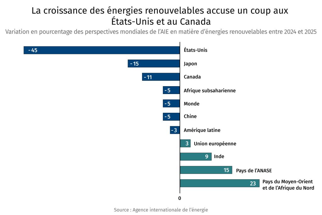 ➔ L’Agence internationale de l’énergie (AIE) a revu à la baisse ses prévisions de croissance des énergies renouvelables au Canada. Dans son récent rapport, elle s’attend toujours à ce que le Canada ajoute 21 gigawatts de capacité en matière d’énergies renouvelables d’ici 2030, soit près du double de la croissance enregistrée au cours des six dernières années, et ce, principalement dans les domaines de l’énergie éolienne terrestre et de l’énergie solaire photovoltaïque à des fins commerciales. Cependant, cela représente une baisse de 11 % par rapport à ses prévisions de 2024. Cette réévaluation s’explique notamment par les difficultés persistantes liées au réseau électrique, ainsi que les modifications apportées aux politiques et à la réglementation en Alberta. L’AIE constate également un revirement majeur ailleurs dans le monde. En effet, la croissance des énergies renouvelables s’essouffle aux États-Unis et en Chine, les deux plus grands marchés mondiaux, dans un contexte de changements politiques, de vulnérabilité des chaînes logistiques et de pressions financières.