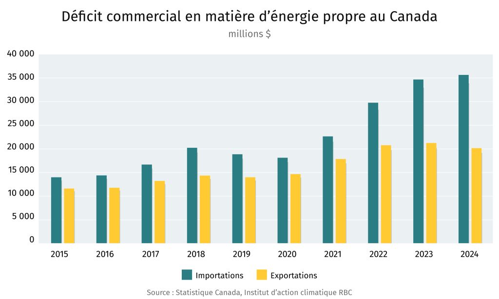 ➔ Le déficit commercial écotechnologique du Canada ne cesse d’augmenter. Le déficit commercial environnemental et écotechnologique du pays n’a cessé d’augmenter pour s’établir à 15,6 milliards de dollars en 2024, comparativement à 2,4 milliards il y a dix ans, selon les dernières données de Statistique Canada . Les importations d’électricité propre, soit l’atout climatique le plus prisé du Canada, ont bondi ces dernières années, alors que les exportations chutaient en raison de la sécheresse et de la demande intérieure croissante d’électricité. Selon l’économiste Farhad Panahov, le matériel écotechnologique, des éoliennes aux véhicules électriques et au matériel de traitement de l’eau, représentait environ 80 % de la croissance des importations, en phase avec les fortes tendances d’adoption et de déploiement au Canada au cours de la même période.