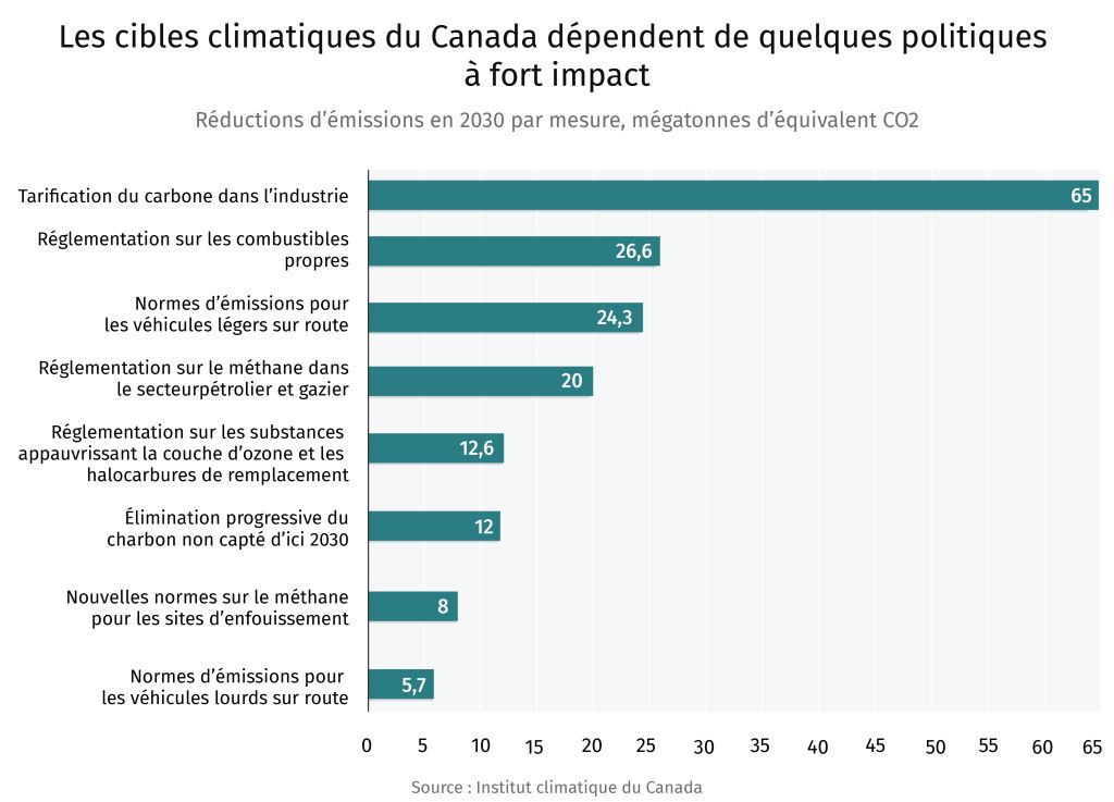 Le 1er avril pourrait-il représenter un point de bascule pour réaligner la trajectoire climatique du Canada ? Selon le dernier rapport de l’Institut climatique du Canada, qui souligne que le pays est actuellement « hors trajectoire » par rapport à ses objectifs climatiques, le renforcement de mesures comme la tarification du carbone dans le secteur industriel et la réglementation du méthane pour le pétrole et le gaz apparaît essentiel pour se rapprocher des cibles établies. Ces deux initiatives sont intégrées au protocole d’entente que le gouvernement fédéral et la province de l’Alberta ont convenu de finaliser d’ici le 1er avril. La mise en œuvre conjointe de ces politiques pourrait générer une réduction significative des émissions (voir graphique).