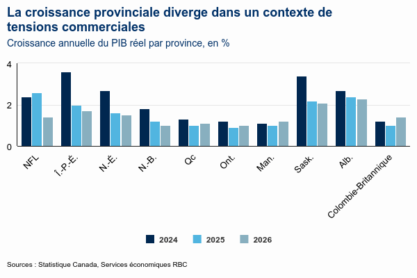 Selon les Services économiques RBC, alors que le Canada subit un choc national en raison de sa relation commerciale avec les États-Unis, les provinces connaissent des chocs distincts qui créent des divergences tant dans la croissance que dans les moteurs de croissance. Lire le rapport complet Mise à jour trimestrielle canadienne : une croissance faible, mais positive est attendue