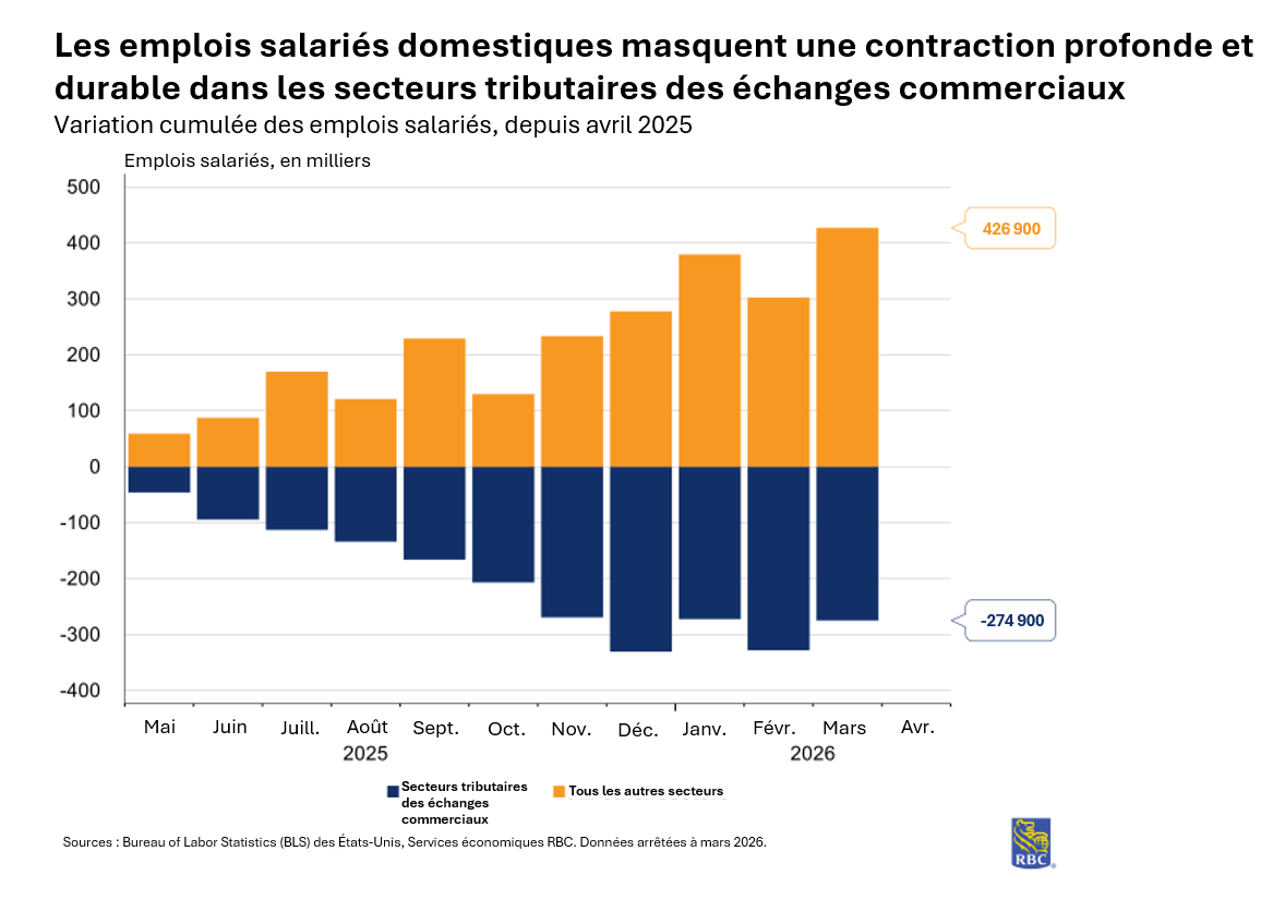 Il y a un an, Donald Trump se tenait dans la roseraie de la Maison-Blanche pour annoncer les droits de douane du « jour de la libération » de son administration. Cette semaine, nos collègues des Services économiques RBC ont examiné de près les répercussions de ces droits de douane. Voici quelques constats clés à retenir (cliquez sur les liens pour approfondir l’analyse) :