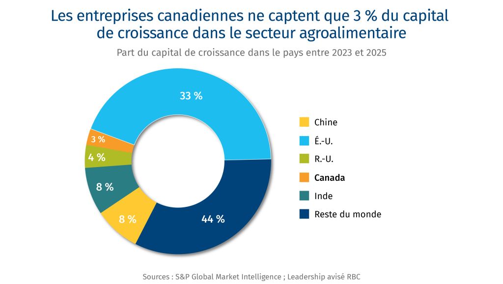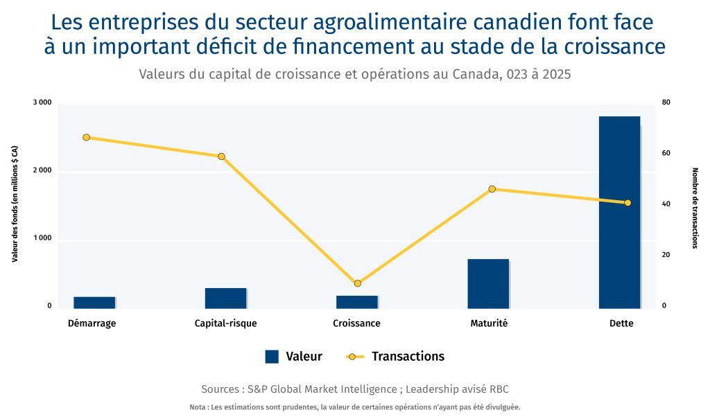 L’ampleur, la répartition et la valeur du capital de croissance investi dans les entreprises en expansion d’un secteur sont des indicateurs de sa dynamique et de ses perspectives de croissance. Au Canada, les marchés en amont et intermédiairesd — allant des intrants agricoles à la transformation alimentaire — bénéficient généralement d’un bon accès aux capitaux en phase initiale grâce aux subventions gouvernementales, aux bureaux de gestion de patrimoine familial et aux sociétés de capital-risque. Les marchés en aval, comme les marques alimentaires, ont moins accès à ce type de financement, avec un nombre réduit de fonds de capital-risque actifs. Les entreprises agroalimentaires, quel que soit leur segment de marché, commencent à se heurter au défi canadien du capital de croissance : des fonds internes fragmentés et limités lorsqu’il s’agit de lever 15 millions de dollars ou plus. Il existe un écart important en matière de financement de croissance dans l’ensemble des secteurs économiques, les sociétés de capital-risque nationales n’étant généralement pas en mesure d’injecter plus de 30 millions de dollars. Cette situation freine l’expansion des entreprises et réduit la capacité du Canada à attirer et à retenir des sociétés agroalimentaires à fort potentiel. La complexité du secteur agroalimentaire canadien accentue ce problème, car les investisseurs généralistes ont du mal à s’y retrouver sans expertise sectorielle. Les capitaux mobilisés, par exemple, pour soutenir une entreprise de technologies agricoles sont souvent complètement différents de ceux qui s’intéressent à une marque alimentaire, leurs indicateurs de croissance, marchés et besoins en capitaux étant très différents (par exemple, propriété intellectuelle ou entrepôt de distribution).