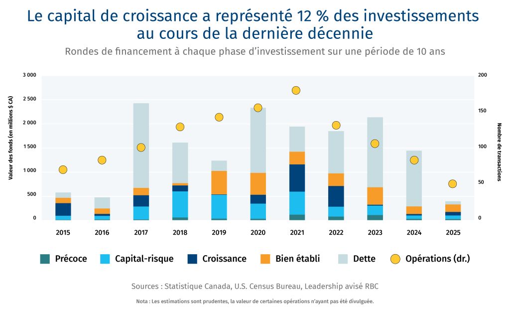 Bien que certains signes positifs aient émergé au cours des cinq dernières années — notamment la progression du capital-investissement et l’orientation vers des entreprises matures et à fort impact — les défis fondamentaux pour attirer et retenir le capital demeurent. Le défi le plus évident se situe à la phase de croissance. La valeur du capital disponible au Canada pour les entreprises en phase de croissance est d’environ 37 % inférieure à celle en phase de capital-risque, où les entreprises en démarrage bénéficient davantage du soutien des sociétés de capital-risque et des incubateurs7.