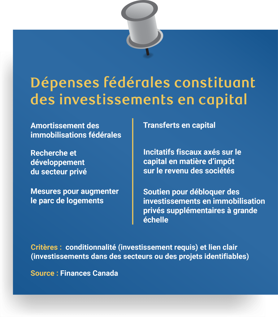 Les dépenses en capital sont assez clairement définies : le ministère des Finances Canada a récemment établi des critères définissant les six catégories de dépenses qui constituent des investissements en capital, mais il reste à voir dans quelle mesure ces critères seront appliqués. Dans le programme du Parti libéral, les dépenses en capital représentent actuellement environ 1 % du PIB annuel et devraient croître sous le gouvernement actuel. Selon nos estimations, elles s’établissent à 0,8 % pour 2023-2024, mais les données publiques ne sont pas suffisantes pour permettre une évaluation.