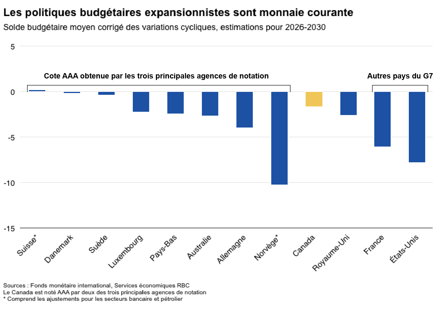 Nous avons souligné ici et ici que les marchés sont impitoyables pour les plus faibles et que le Canada fait relativement bonne figure sur le plan des indicateurs budgétaires. La dette brute du gouvernement est élevée par rapport à d’autres pays notés AAA, mais sa dette nette, beaucoup plus modérée, est la plus basse du G7. Le Canada n’est pas le seul à avoir connu des déficits élevés et une dynamique de croissance difficile ; à bien des égards, il s’en est relativement mieux tiré. Par exemple, les déficits structurels ont été inférieurs à ceux de nombreux autres pays comparables.