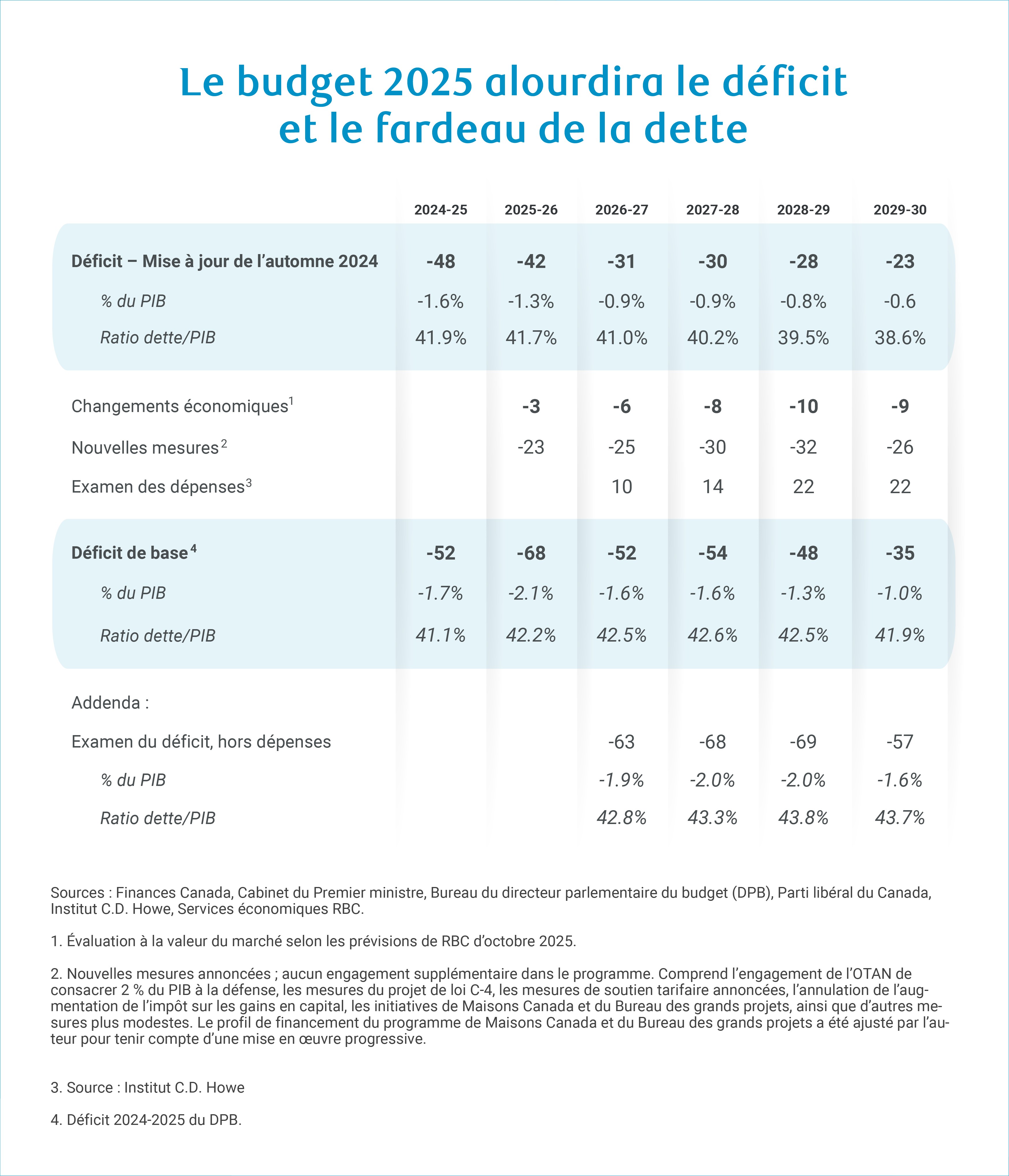 Jusqu’à présent, nous avons modérément revu à la hausse les prévisions de croissance des dépenses publiques de 0,1 point de pourcentage en 2025 et de 0,3 point de pourcentage en 2026. S’il apparaît que les dépenses fédérales atteindront notre niveau de référence, nous devrons revoir la part budgétaire du PIB.