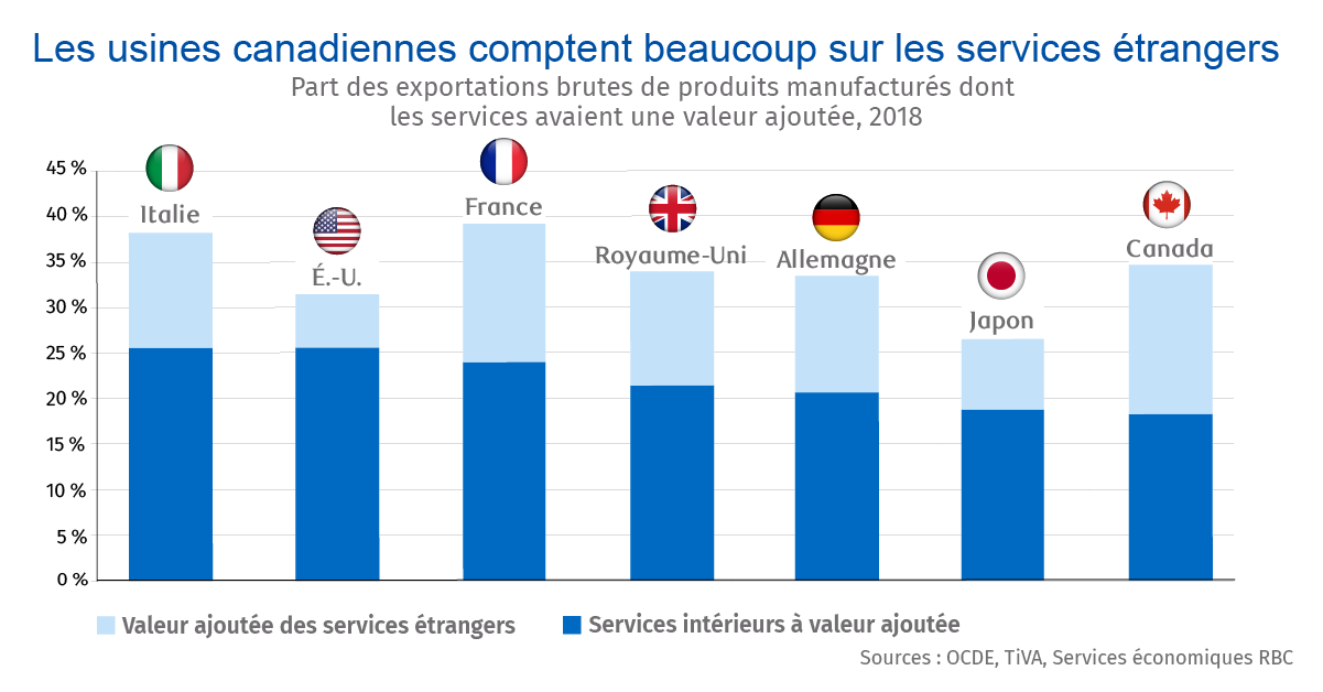 - Pourtant, près de la moitié des services intégrés à nos exportations de biens proviennent de l’extérieur du pays, notamment en raison de la forte participation étrangère dans le secteur manufacturier canadien.