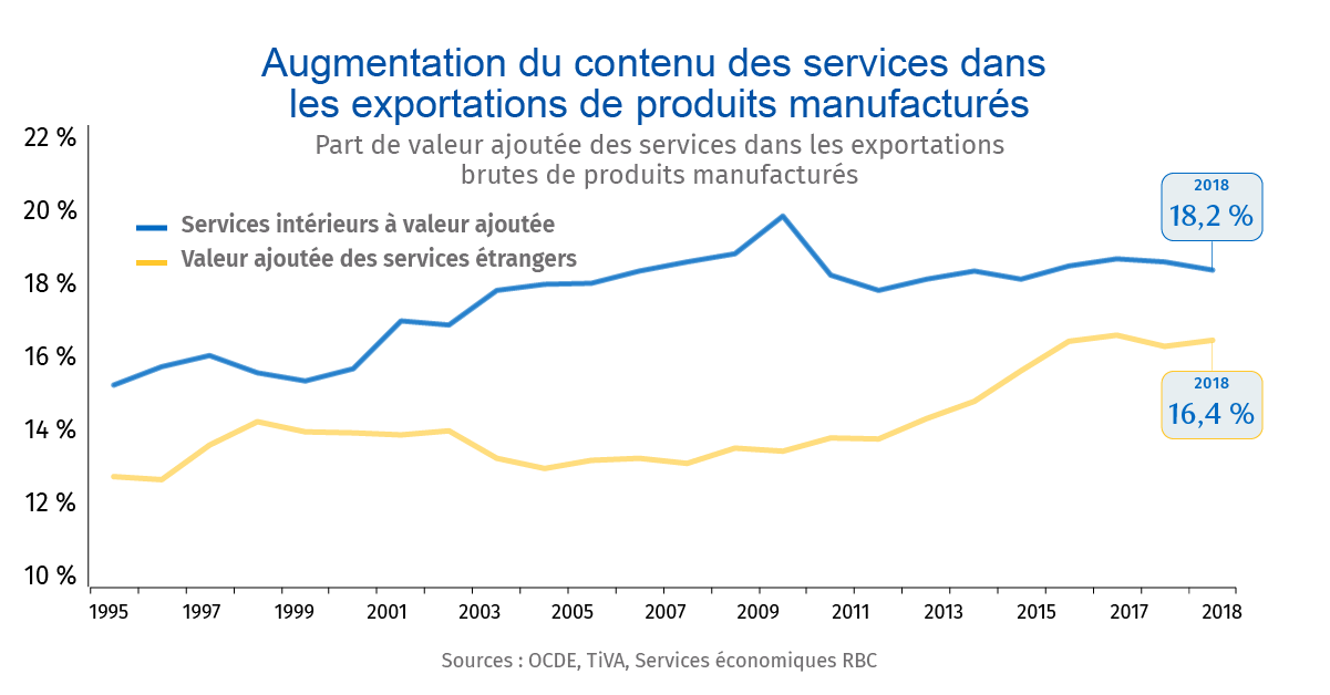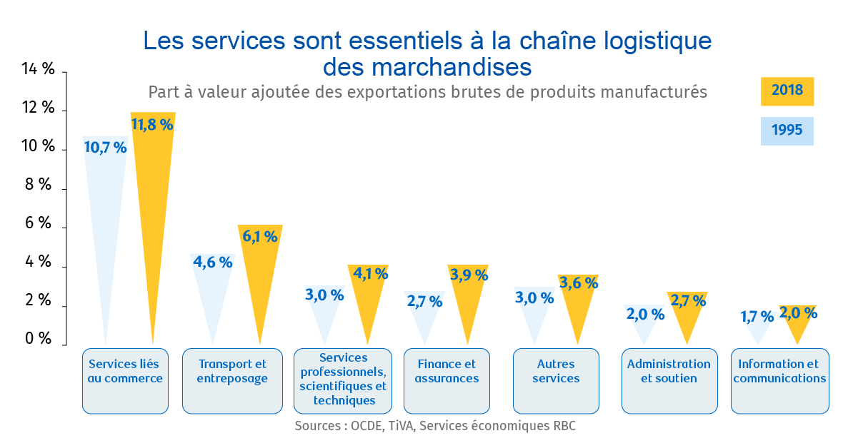 La base de données de l’OCDE sur la valeur ajoutée au commerce (TiVA) montre que les services représentaient 34 % de la valeur ajoutée des exportations de produits manufacturés du Canada en 2018, comparativement à 28 % en 1995. Les services commerciaux, le transport et l’entreposage, les services financiers et d’assurance, les services juridiques, comptables, publicitaires, architecturaux, techniques et de conception, et les services administratifs et de soutien, représentent tous des liens croissants dans les chaînes logistiques de fabrication.